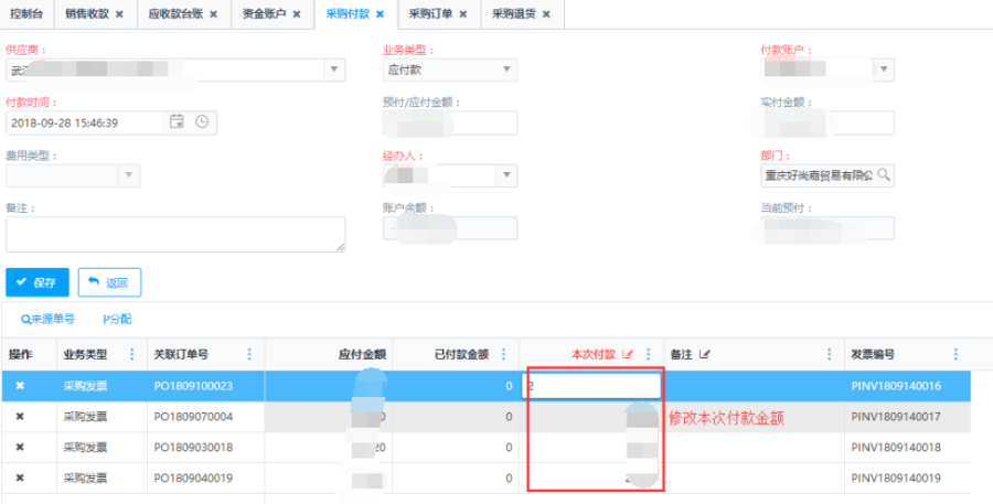 第四步:修改订单付款金额明细,点击<保存>按钮,完成销采购付款单创建。