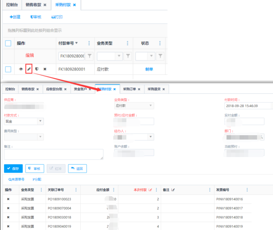 制单状态下的采购付款单,点击<编辑>按钮,可以对采购付款单进行编辑操作。在编辑页面也可以进行审核操作,审核该采购付款单。