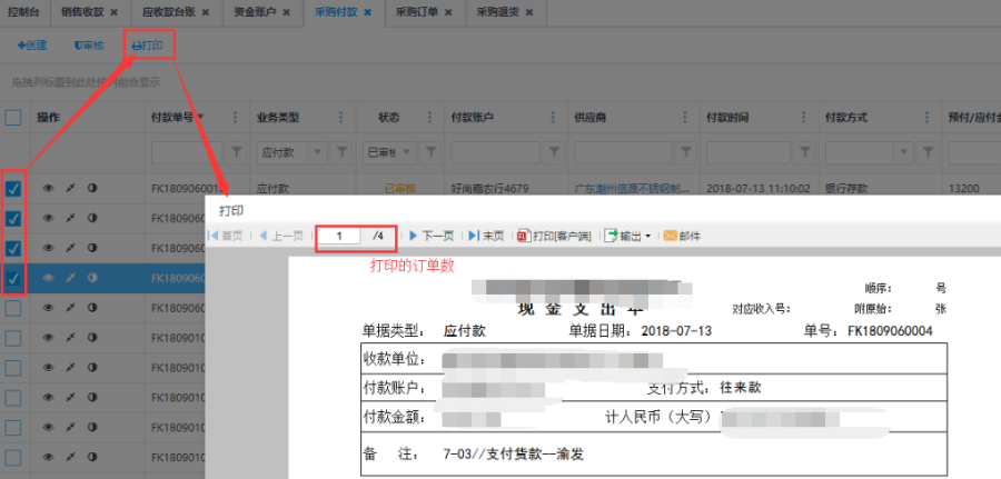 • 2.批量打印:可根据相同的<业务类型>进行批量打印。例如:多选择业务类型为"应付款" 的采购付款单,点击打印,可以打印多张采购付款单。