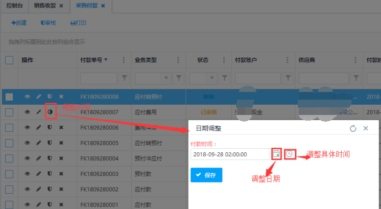 已审核状态下的采购付款单,点击<调整日期>按钮可调整订单付款时间。