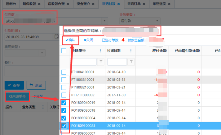 第三步:选中所需付款的订单点击左上方<确认>按钮,既可将所选中的订单添加到采购付款单里: