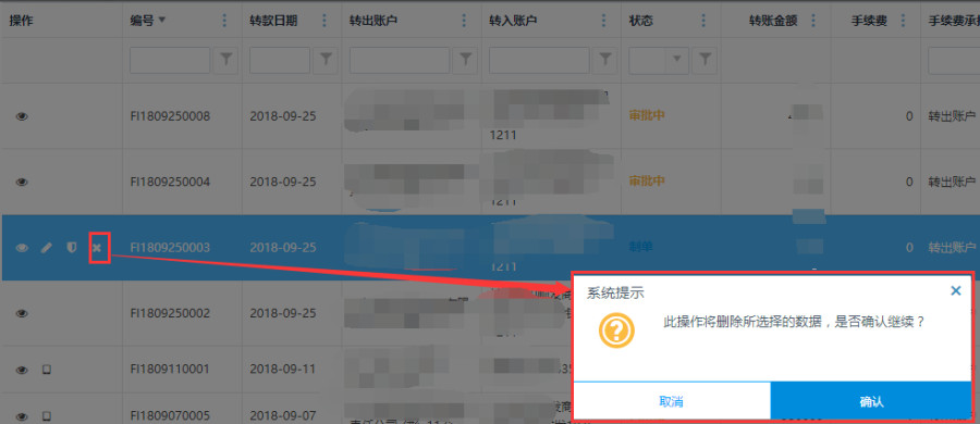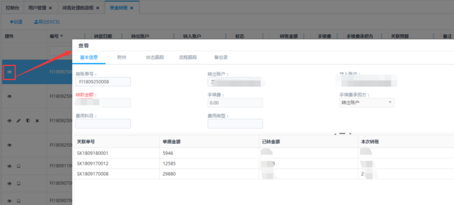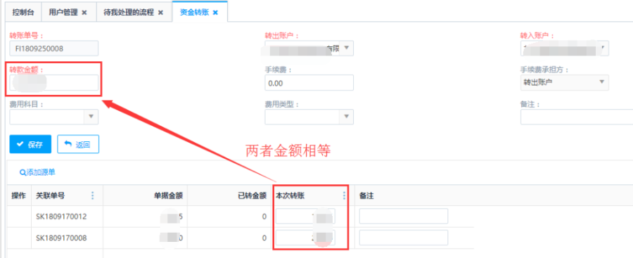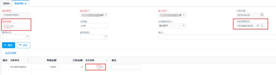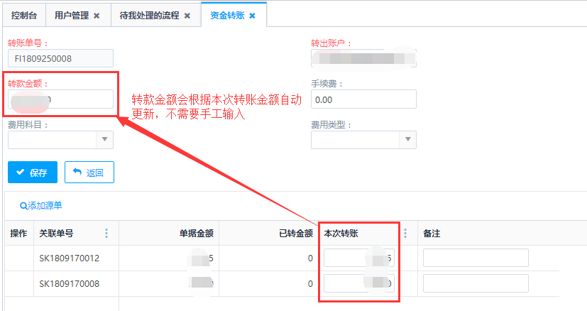 注:列表里的【本次转账】与主单里的【转账金额】会自动更新,不需要手工输入。