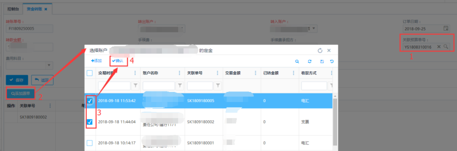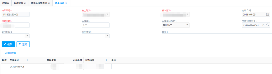 - 得到转款金额的三种操作:1.手工输入金额;2.选择关联预算单号,添加源单(如图);3.直接添加源单(如图)。选择预算管理单号和源单后会自动得到转款金额。