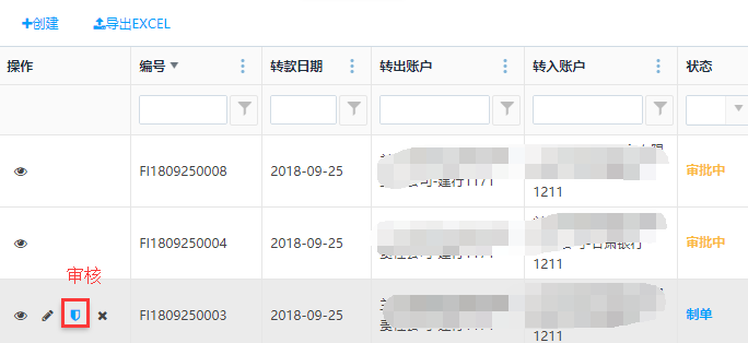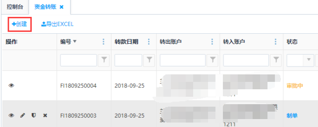 第一步:点击列表左上方<创建>按钮,进入资金转账的创建页面: