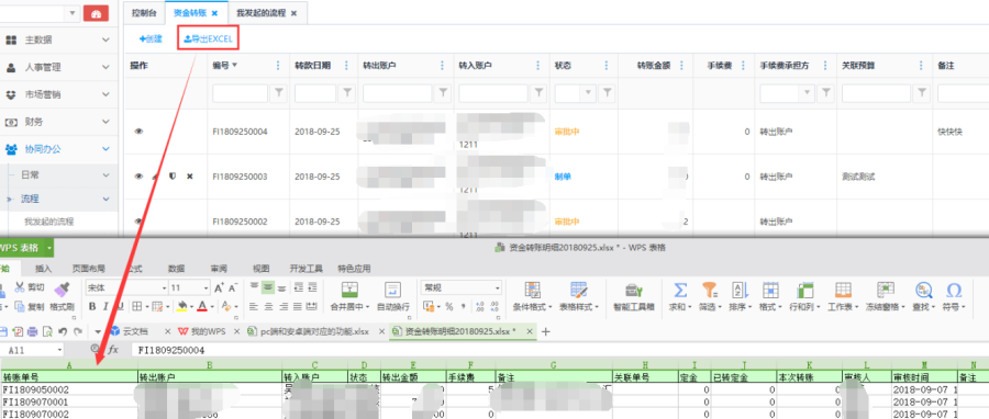 点击列表上方的<导出EXCEL>按钮可导出资金转账列表所有内容。