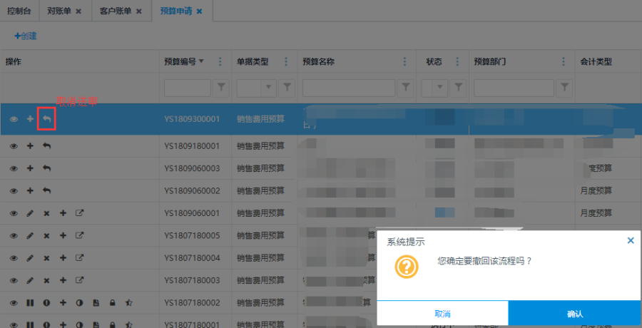 对于"待审批"状态的预算申请单可点击操作栏的<取消送审>按钮,单据状态转换为"草稿",可以对单据进行修改和删除操作。