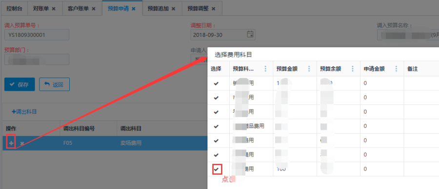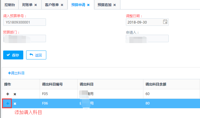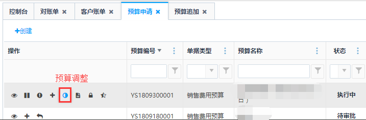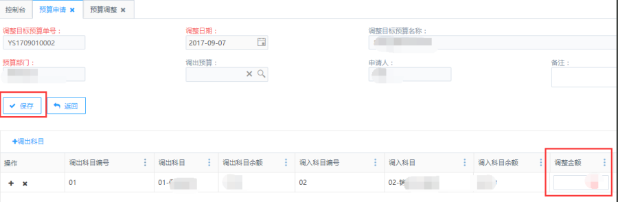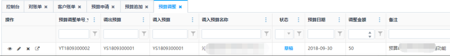 第一步:点击列表操作栏的<预算调整>按钮,进入到预算调整页面: