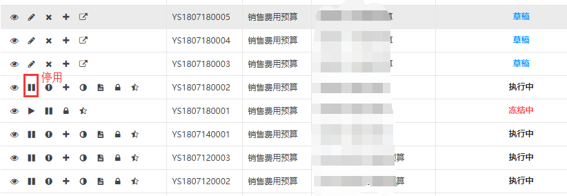 对于"执行中"、"冻结中"的预算申请单,可点击列表操作栏的<停用>按钮,单据状态转换为"已停用",该预算无法申请费用并且原已经申请的费用也无法进行操作。
