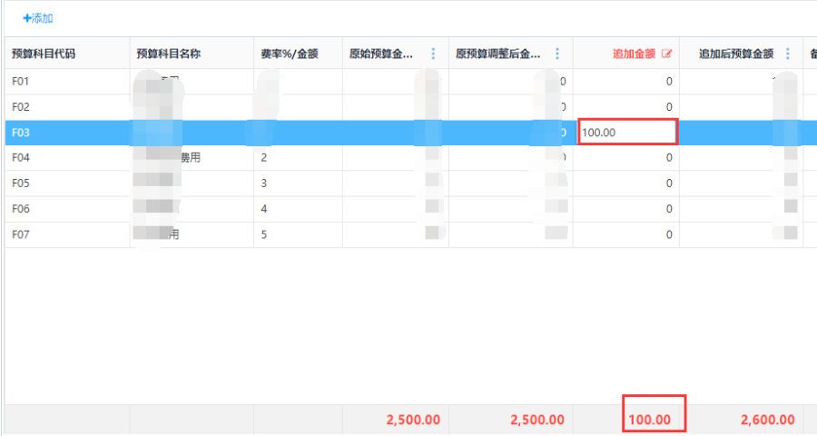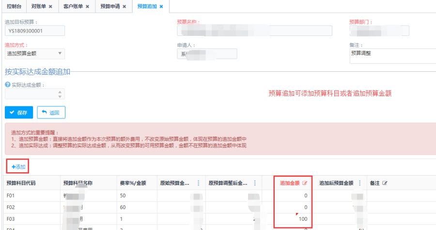 第二步:进入添加预算追加页面,点击<添加>按钮选择需要追加的预算科目: