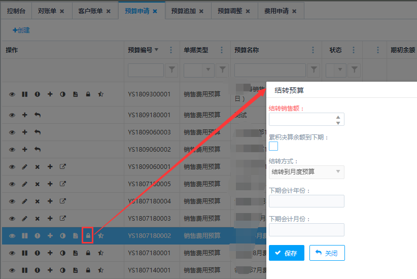 点击列表操作栏的<结转>按钮,可对预算申请单进行结转操作。