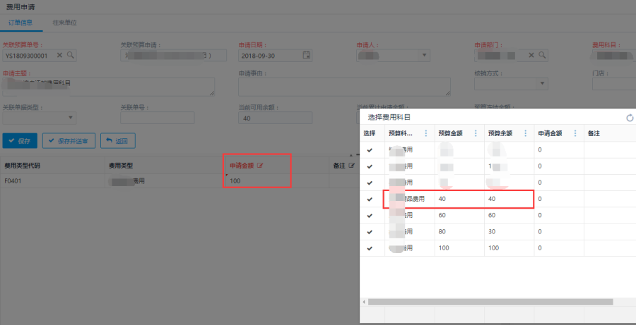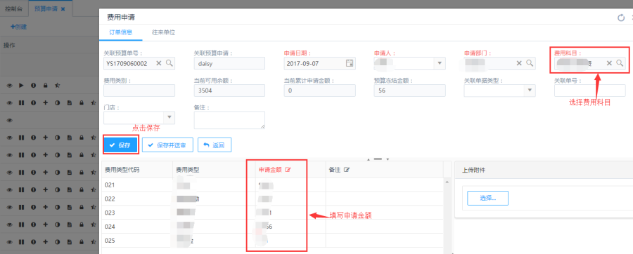 注:申请金额不能比选择的费用科目里的预算余额多(如图)