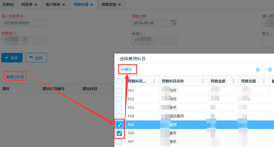 第二步:进入预算调整页面,点击<调出科目>按钮,选中所需调出的科目,点击列表左上方的<确定>按钮,既可将所选中的预算科目添加到预算调整的调出科目里: