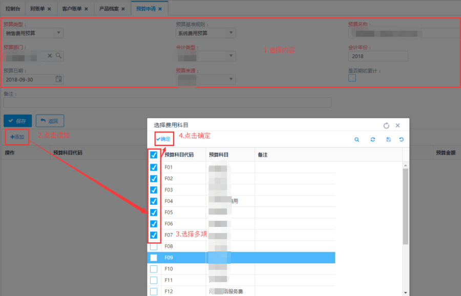 第二步:编辑预算申请内容,点击<添加>按钮选择费用科目:
