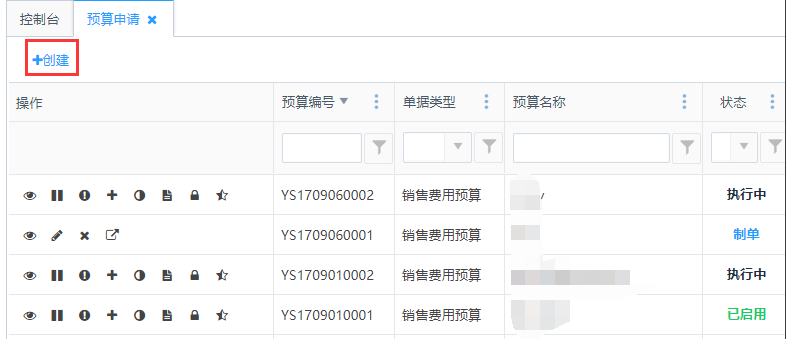 对于"已审核"、"冻结中"的预算申请单,可点击列表操作栏的<启用>按钮,单据状态转换为"已启用",该预算单就可以使用。