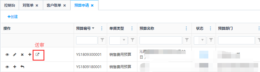对于"草稿"状态的预算申请单可点击操作栏的<送审>按钮,单据状态转换为"待审批",将不能再进行修改和删除操作。