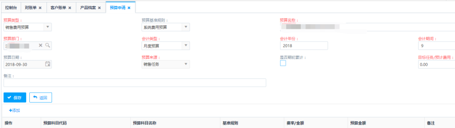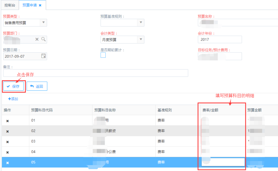 第四步:填写预算科目的"费率/金额",点击<保存>按钮,完成预算申请单的创建。