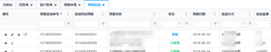 第一步:对于"草稿"、"待审批"、"已驳回"、"已启用"的预算申请单,可点击列表操作栏的<预算追加>按钮,进入到添加预算追加页面: