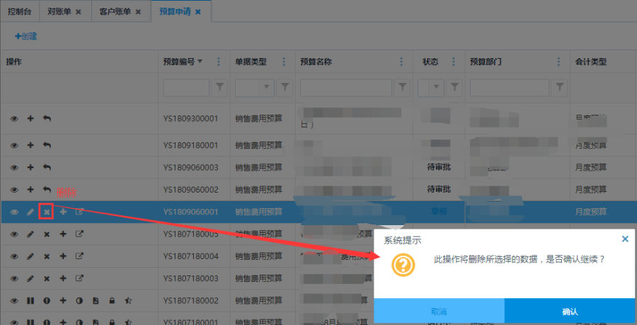 制单状态下的预算申请单,点击操作栏<删除>按钮可删除预算申请单。