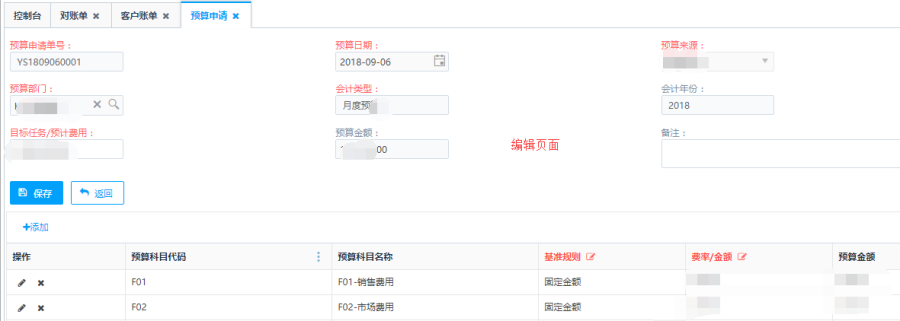 草稿状态下的预算申请单,点击<编辑>按钮,可以对预算申请单进行编辑操作。