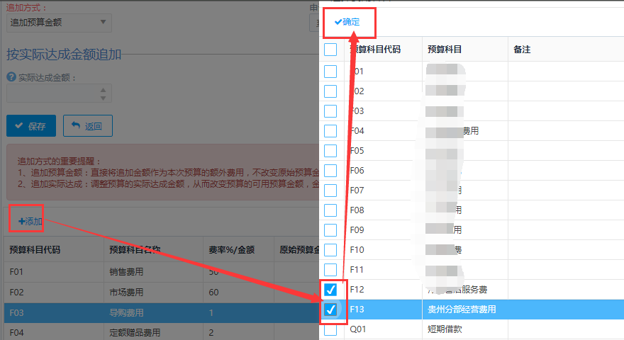 第三步:选中所需追加的预算科目,点击列表左上方的<确定>按钮,既可将所选中的预算科目添加到预算追加里: