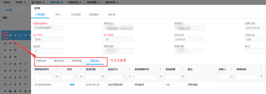 所有状态的订单,点击<查看>按钮,查看当前预算申请单信息。界面内容:订单信息、附件、状态跟踪、流程跟踪、备忘录、预算明细、费用申请、预算调整、预算追加等信息;如果预算申请有做预算追加、预算调整、费用申请等操作会在这里显示相应的单号信息。