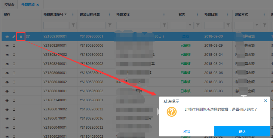 草稿状态下的预算追加单,点击操作栏<删除>按钮可删除预算追加单。