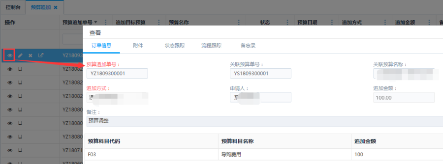 所有状态的订单,点击<查看>按钮,查看当前预算追加申请单信息。界面内容:订单信息、附件、状态跟踪、流程跟踪、备忘录等相应的单号信息。