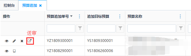 对于"草稿"状态的预算追加单可点击操作栏的<送审>按钮,单据状态转换为"待审批",将不能再进行修改和删除操作。