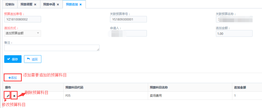 草稿状态下的预算追加单,点击<编辑>按钮,可以对预算追加单进行编辑操作。