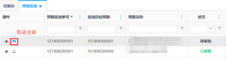 对于"待审批"状态的预算追加单可点击操作栏的<取消送审>按钮,单据状态转换为"草稿",可以对单据进行修改和删除操作。