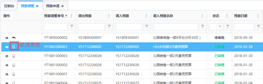 对于"已审核"状态的预算调整单,可点击操作栏的<取消审核>按钮,单据状态转换为"草稿",可以对单据进行修改和删除操作。