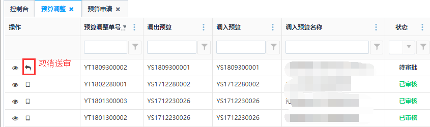 对于"待审批"状态的预算调整单可点击操作栏的<取消送审>按钮,单据状态转换为"草稿",可以对单据进行修改和删除操作。