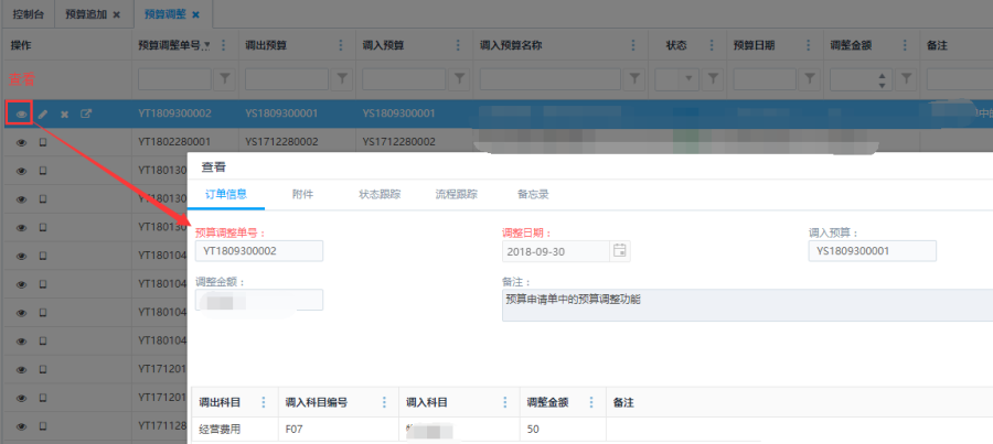 所有状态的订单,点击<查看>按钮,查看当前预算调整申请单信息。界面内容:订单信息、附件、状态跟踪、流程跟踪、备忘录等相应的单号信息。
