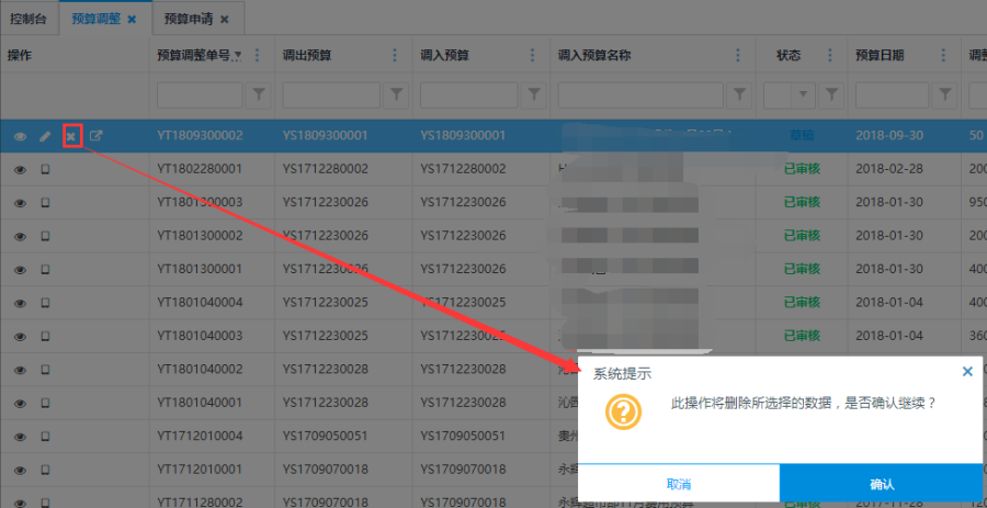 草稿状态下的预算调整单,点击操作栏<删除>按钮可删除预算调整单。