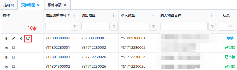 注:草稿状态的预算调整单是从预算申请中的预算调整生成。(参考预算申请预算调整操作)