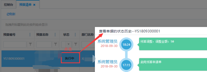 点击状态下的状态查看,例如:点击为"执行中"的状态,可以查看该单据状态历史记录