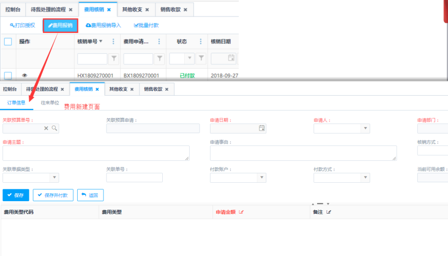 第二步:费用核销创建页面,先选择关联预算单,然后选择申请日期、申请人、申请部门、费用科目,输入申请主题,输入申请金额点击<保存>或者<保存并付款>按钮,完成费用核销创建。