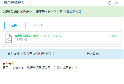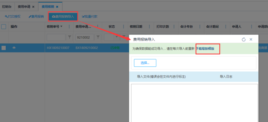 第一步:点击<费用报销导入>按钮,进入费用报销导入界面,下载最新模板。