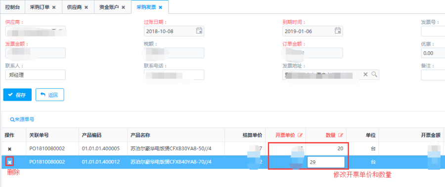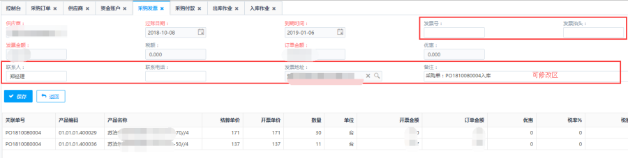 - 发票金额、订单金额:和所选择的采购单关联,选择采购单之后,【发票金额】、【订单金额】会自动带出来,修改了开票单价后【发票金额】会自动更新,修改数量后,【订单金额】和【发票金额】都会更新;