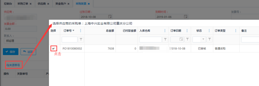第二步:填写采购发票主单内容,点击<来源单号>按钮,选择关联采购单号。