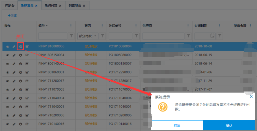 部分付款状态下的采购发票单,点击操作栏的<关闭>按钮,可对采购发票单进行关闭操作。关闭后该发票将不允许再进行付款。