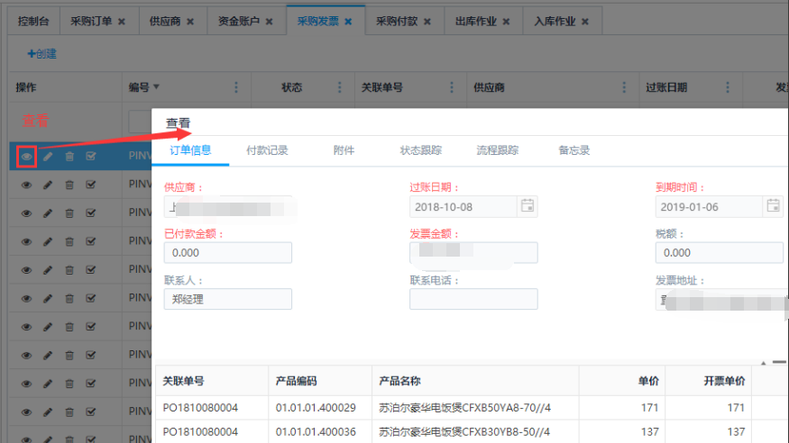 所有状态的订单,点击<查看>按钮,查看当前采购发票单信息。界面内容:订单信息、收款记录、附件、状态跟踪、流程跟踪、备忘录等单号信息。