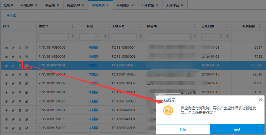 未付款状态下的采购发票单,点击操作栏<取消>按钮,可对采购发票单进行作废操作。取消后该订单会少一条记录。