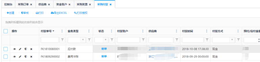 跳转到采购付款页面,选择收款账户、修改本次付款金额(部分或全额),点击保存,会生成一条单据到【财务-资金管理-采购付款】列表里,审核采购付款单后,采购发票单状态变换为"部分付款"或"全部付款"。
