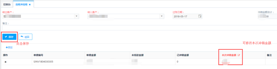 第四步:可修改本次冲销金额,确认无误后点击<保存>返回到主页面。