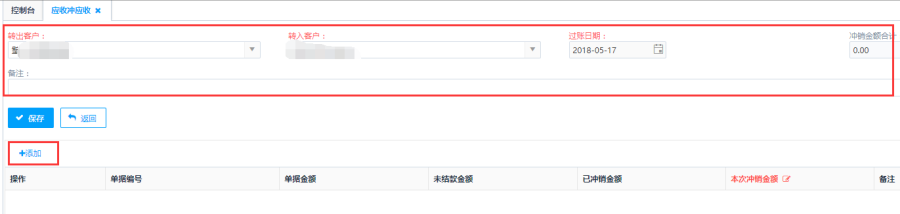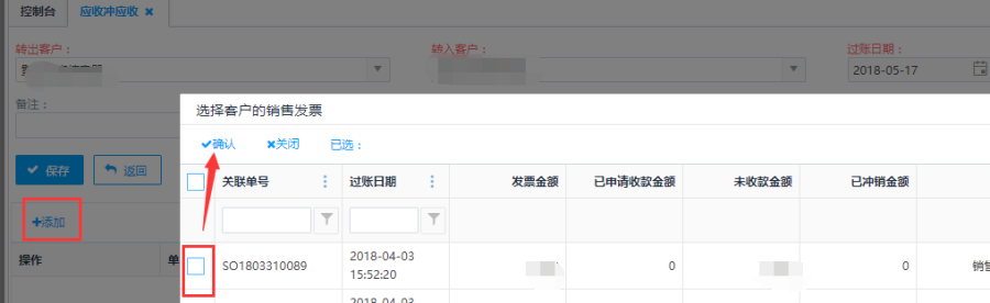 第二步:选择转出客户、转入客户,点击<添加>按钮添加销售发票。