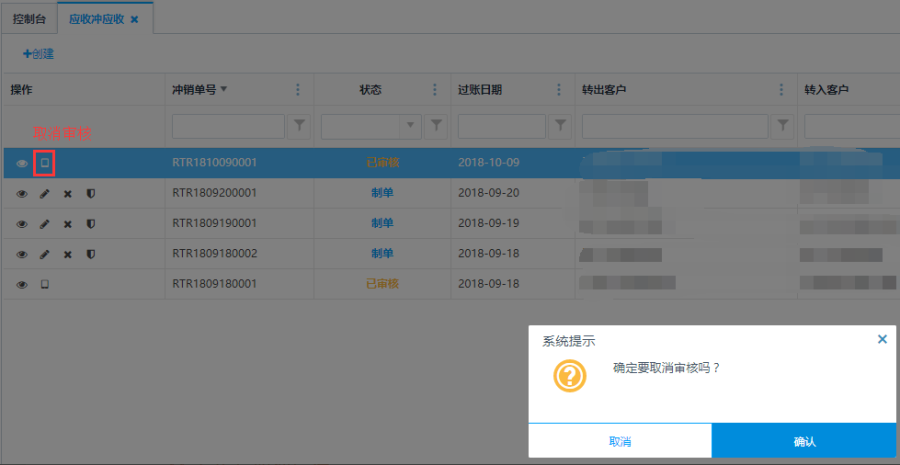 对已审核状态的单据可进行取消审核操作,取消审核之后可以做修改和删除操作。