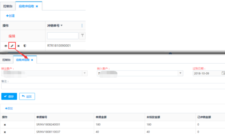 制单状态下的应收冲应收单,点击<编辑>按钮,可以对应收冲应收单进行编辑操作。