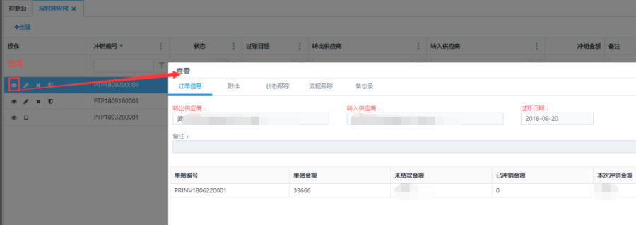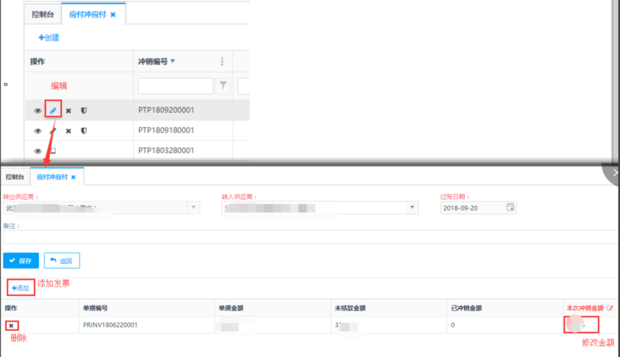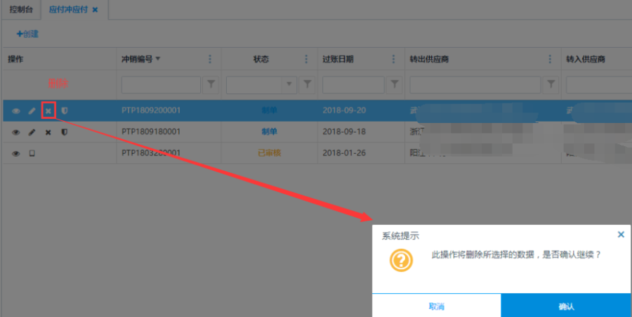 制单状态下的应付冲应付单,点击操作栏<删除>按钮可删除应付冲应付单。
