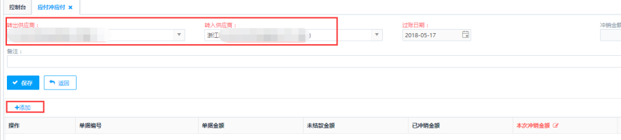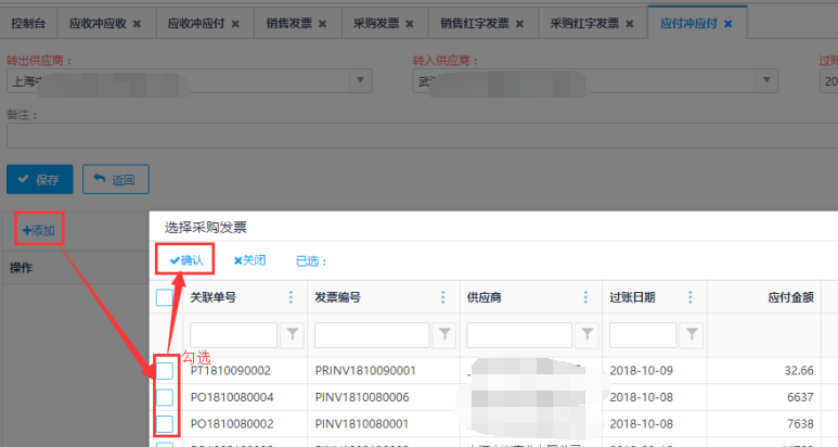 第二步:选择转出供应商、转入供应商,点击<添加>按钮添加采购发票。